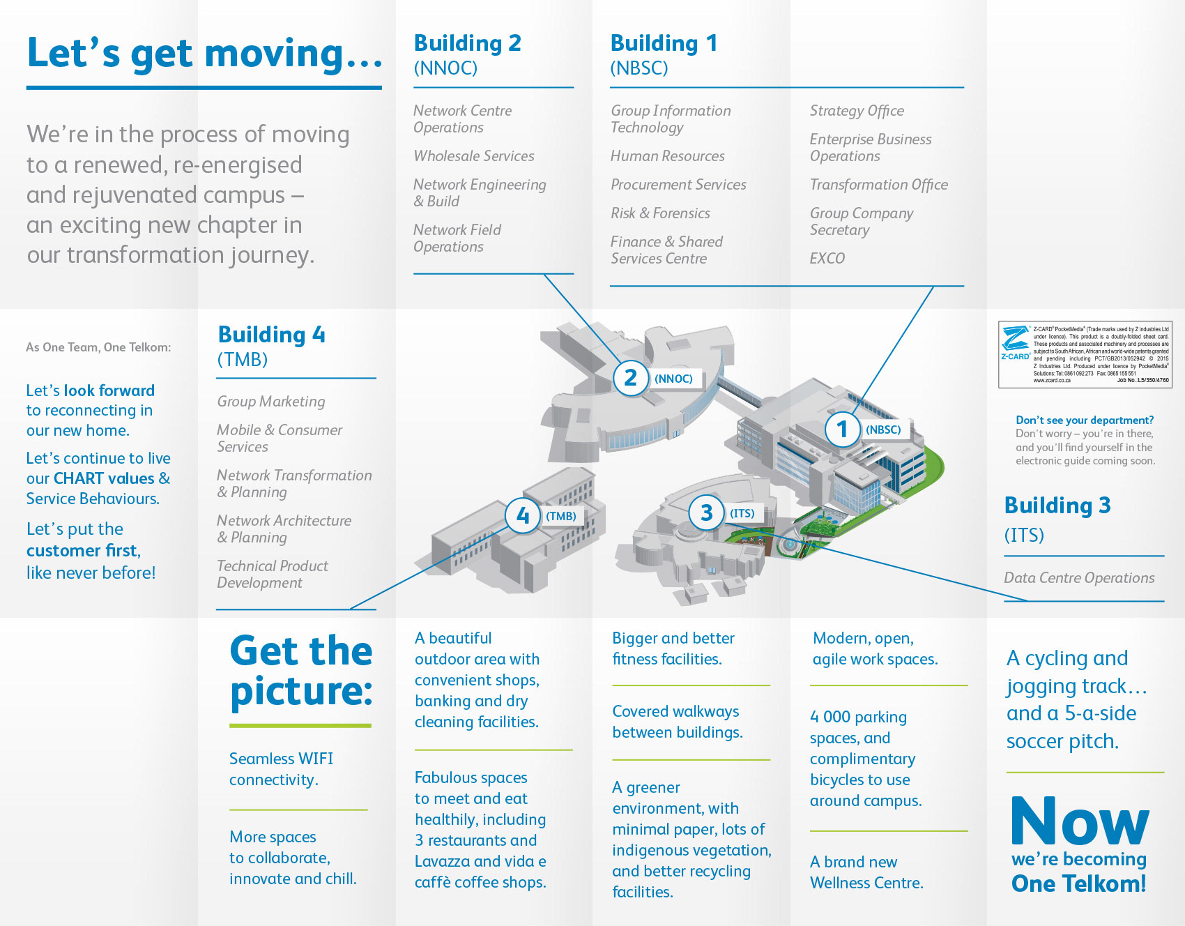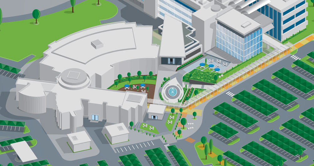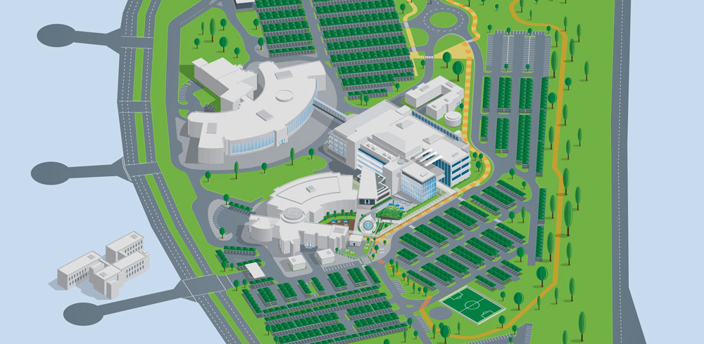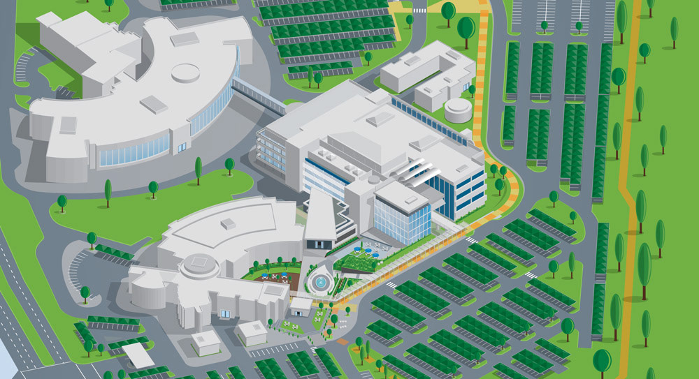 Design of a double-sided z-fold info sheet focusing on an illustration of a map of the client's corporate campus.