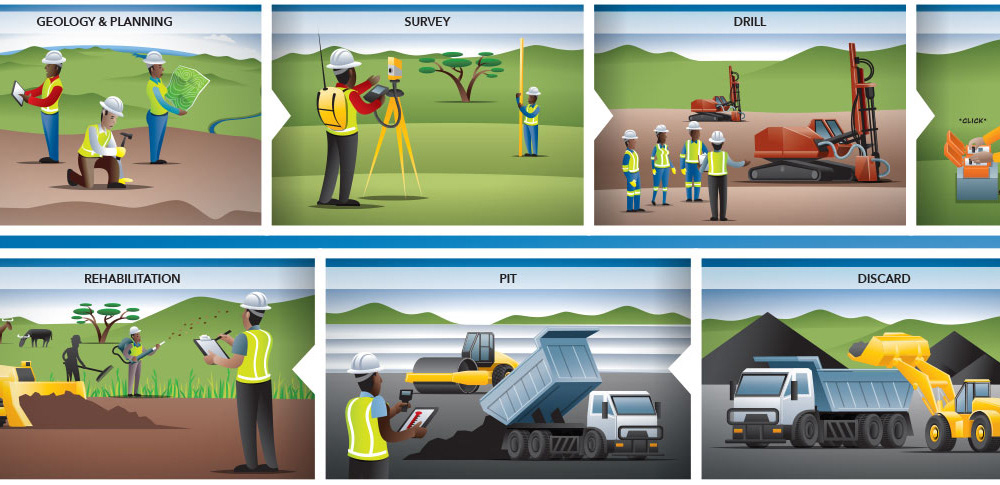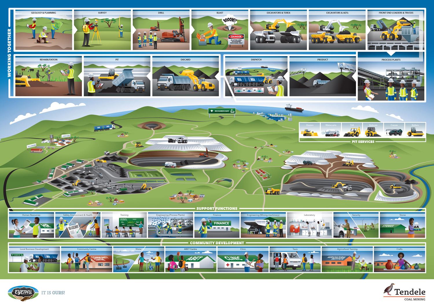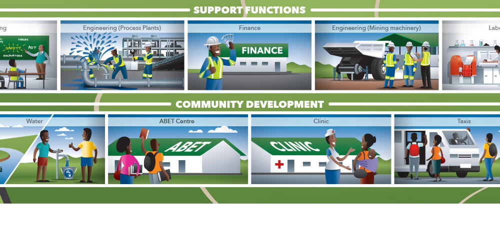 Map illustration and breakdown of functions and services of a coal mine for communicating to staff of the mine their various roles within the greater context.